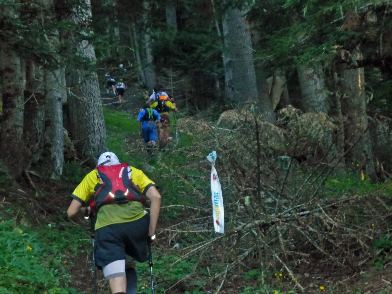 Començem a baixar per pista, ens espera un descens de 1100- en 7km. La primera part és baixa força bé, camí ample etc...per adentrar-nos en corriols entre el bosc força drets i ben parits, quin disfrute i quina descàrrega d'adrenalina. Arribem abaix, el Toni té rampes, li donc una capsula de sals minerals i seguim fins a Vielha on tenim l'avituallament. En aqui aprofito per carregar aigua a sac, menjar uns entrepanets i saludar el David Ariñó que està per allà.